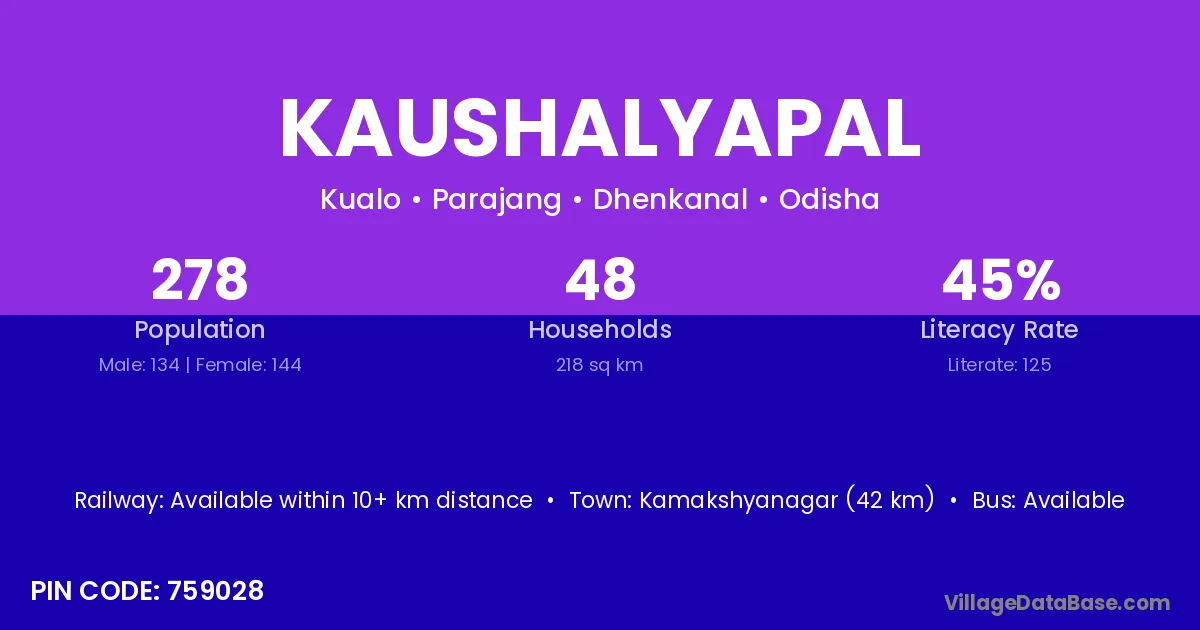 Kamakshyanagar (42 km) is the nearest town to Kaushalyapal village for major economic activities and is located approximately 42 km away.