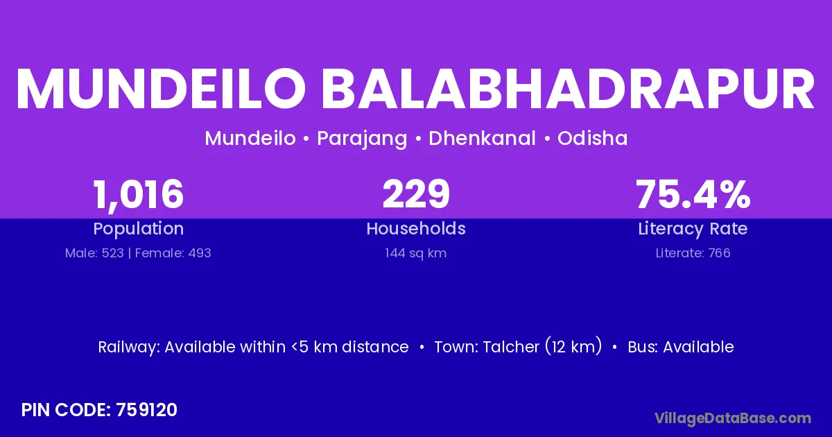 Mundeilo Balabhadrapur village has a total population of 1,016 people, of which 523 are males and 493 are females.