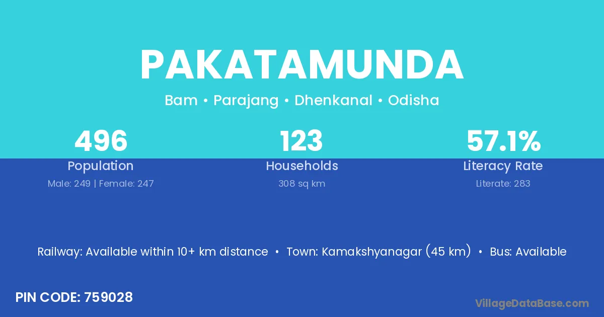 Kamakshyanagar (45 km) is the nearest town to Pakatamunda village for major economic activities and is located approximately 45 km away.