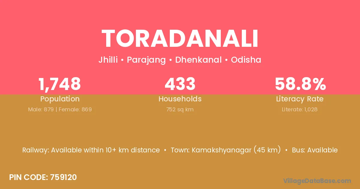 Kamakshyanagar (45 km) is the nearest town to Toradanali village for major economic activities and is located approximately 45 km away.