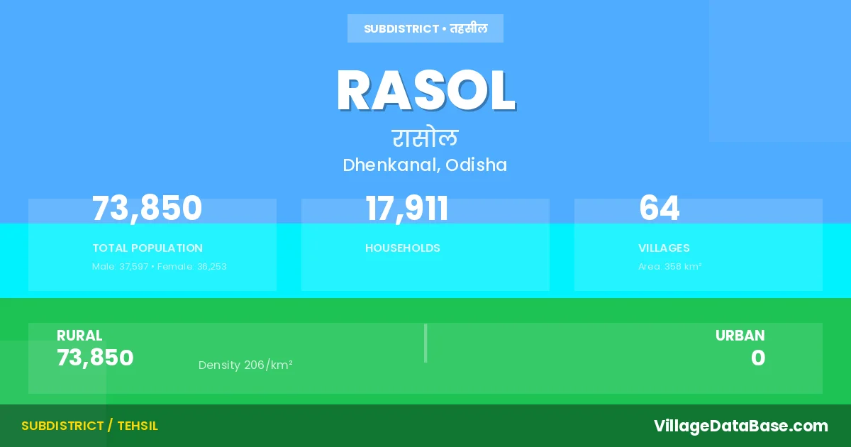 According to the 2011 census The total area of Rasol Tehsil is 358 km², with a population of 73850 people. The population density is 206 inhabitants per square kilometre, and there are approximately 17911 houses in the sub district.