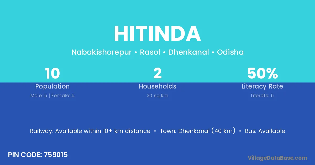 Dhenkanal (40 km) is the nearest town to Hitinda village for major economic activities and is located approximately 40 km away.