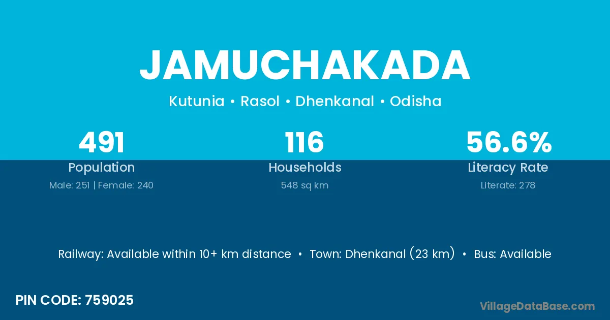 Dhenkanal (23 km) is the nearest town to Jamuchakada village for major economic activities and is located approximately 23 km away.