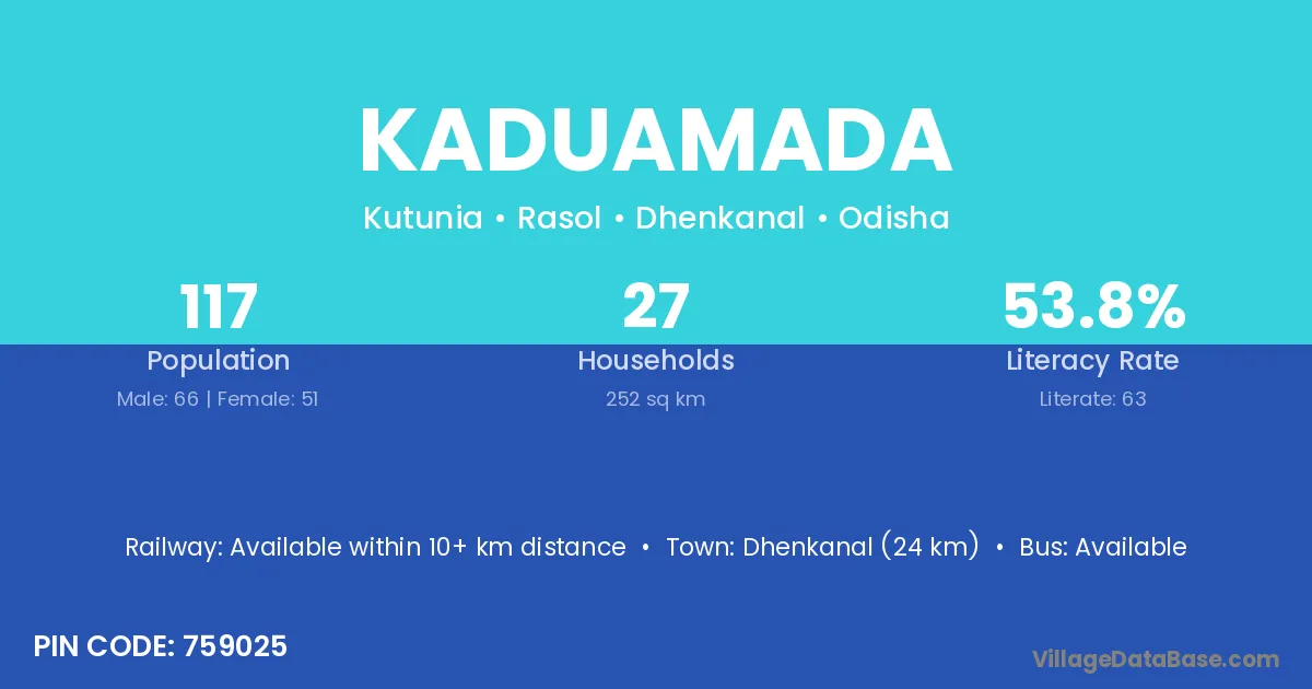 Dhenkanal (24 km) is the nearest town to Kaduamada village for major economic activities and is located approximately 24 km away.