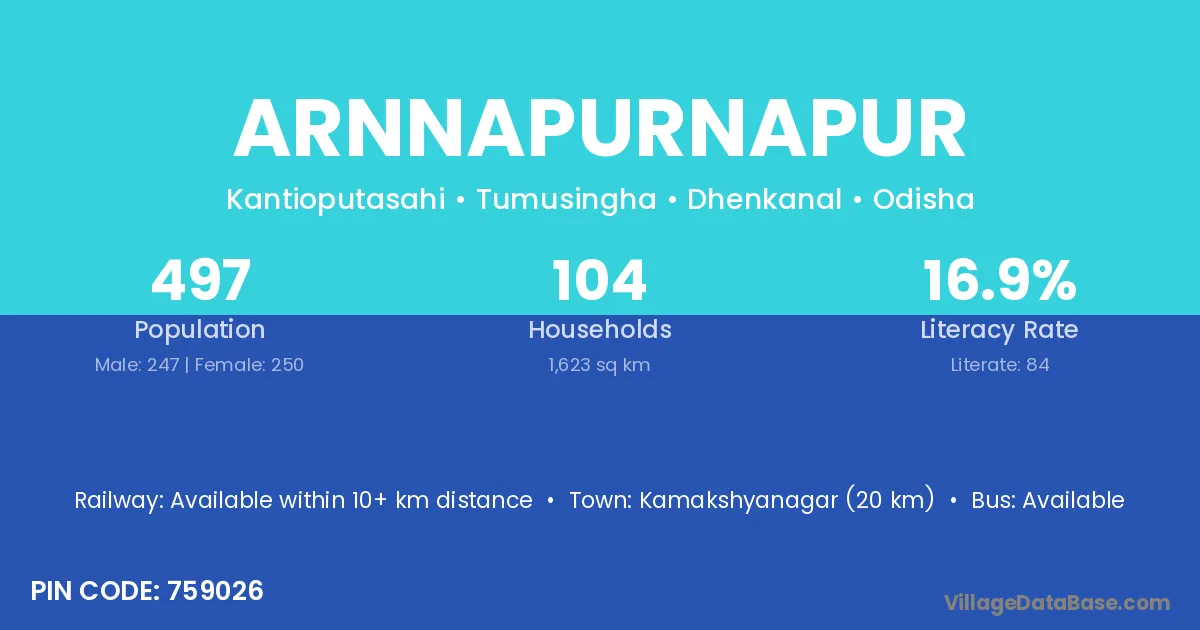 Kamakshyanagar (20 km) is the nearest town to Arnnapurnapur village for major economic activities and is located approximately 20 km away.