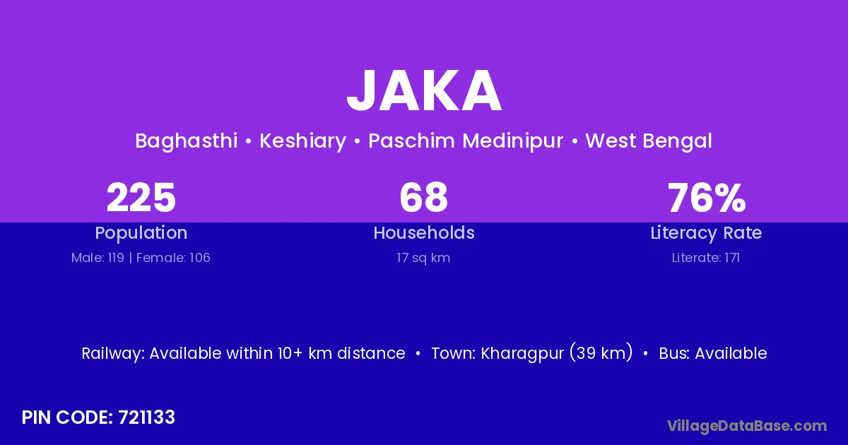 The literacy rate of Jaka village is 70.35%. Male literacy stands at 75.77% and female literacy at 64.62%.