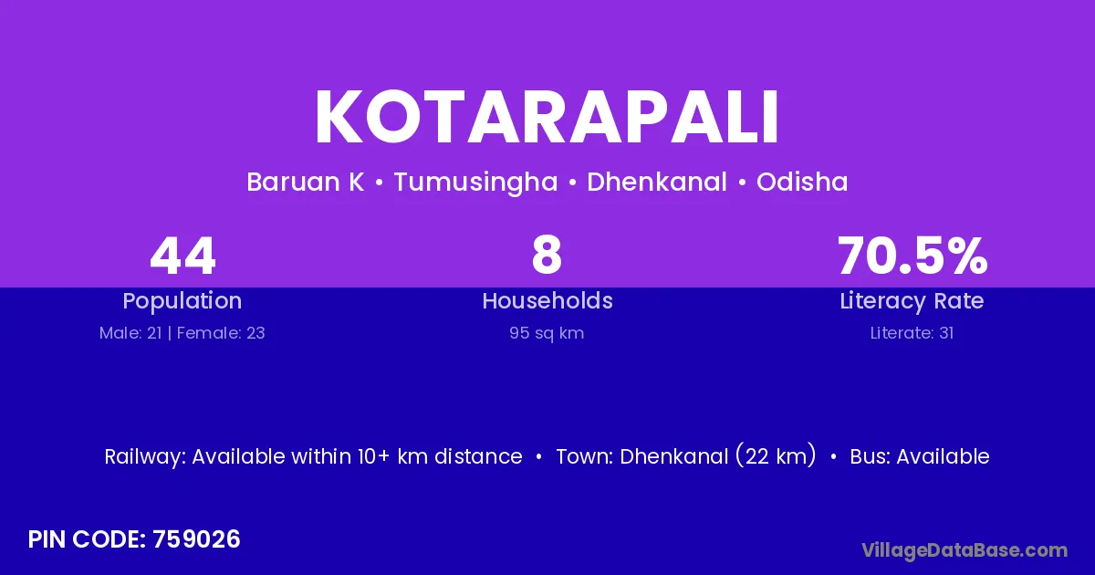 Dhenkanal (22 km) is the nearest town to Kotarapali village for major economic activities and is located approximately 22 km away.