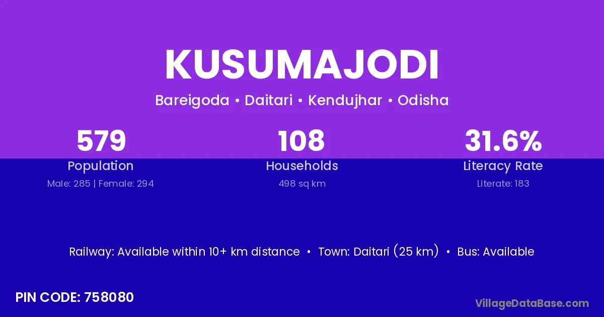 Kamakshyanagar (14 km) is the nearest town to Kusumajodi village for major economic activities and is located approximately 14 km away.