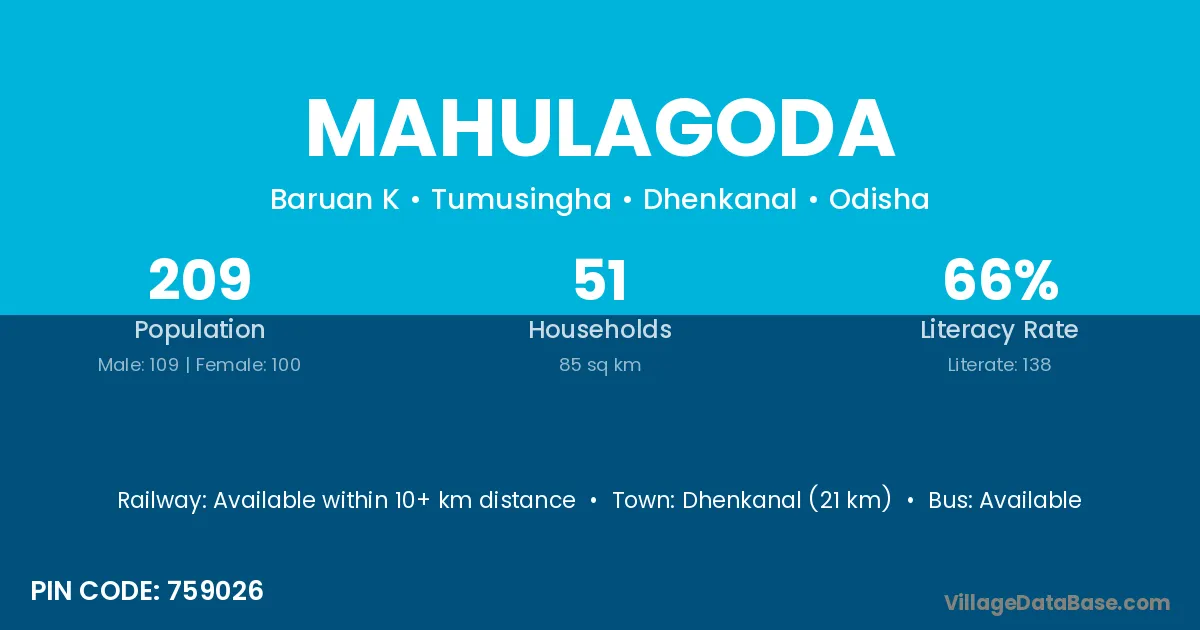 Dhenkanal (21 km) is the nearest town to Mahulagoda village for major economic activities and is located approximately 21 km away.