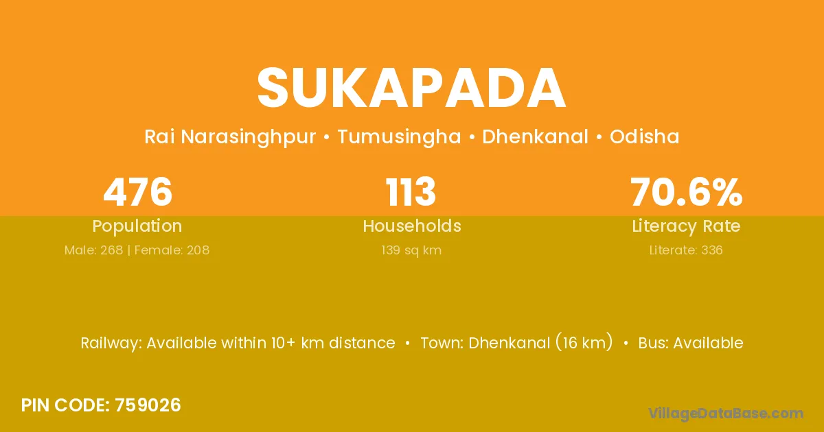 Dhenkanal (16 km) is the nearest town to Sukapada village for major economic activities and is located approximately 16 km away.