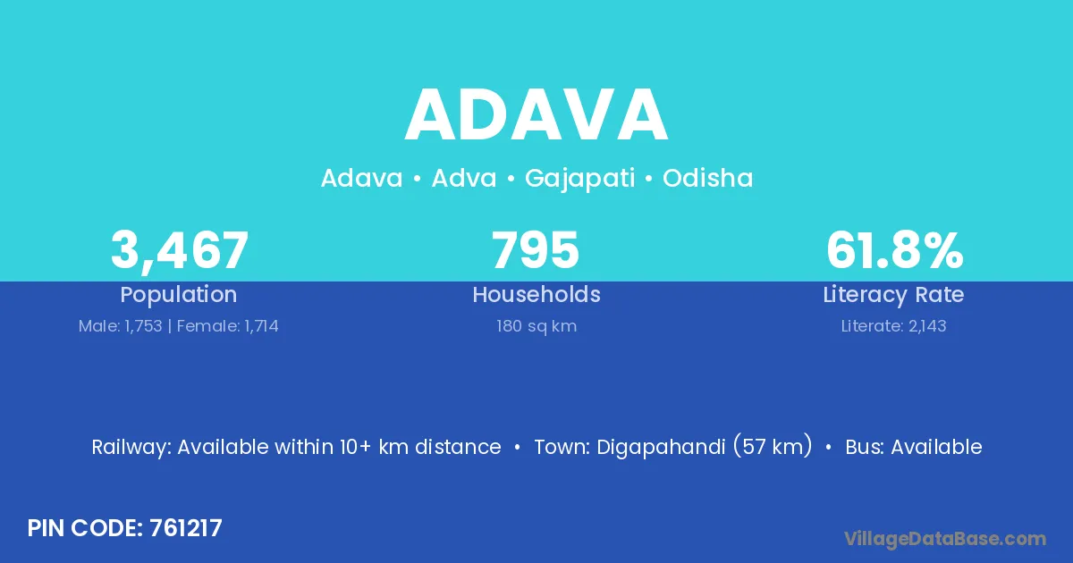 Digapahandi (57 km) is the nearest town to Adava village for major economic activities and is located approximately 57 km away.