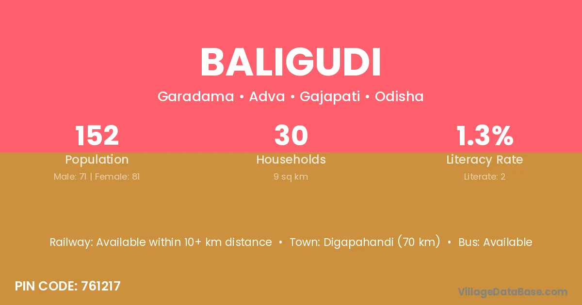 Digapahandi (70 km) is the nearest town to Baligudi village for major economic activities and is located approximately 70 km away.