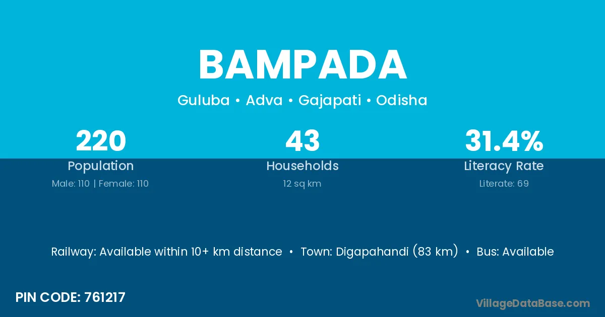 Bampada village has a total population of 220 people, of which 110 are males and 110 are females.