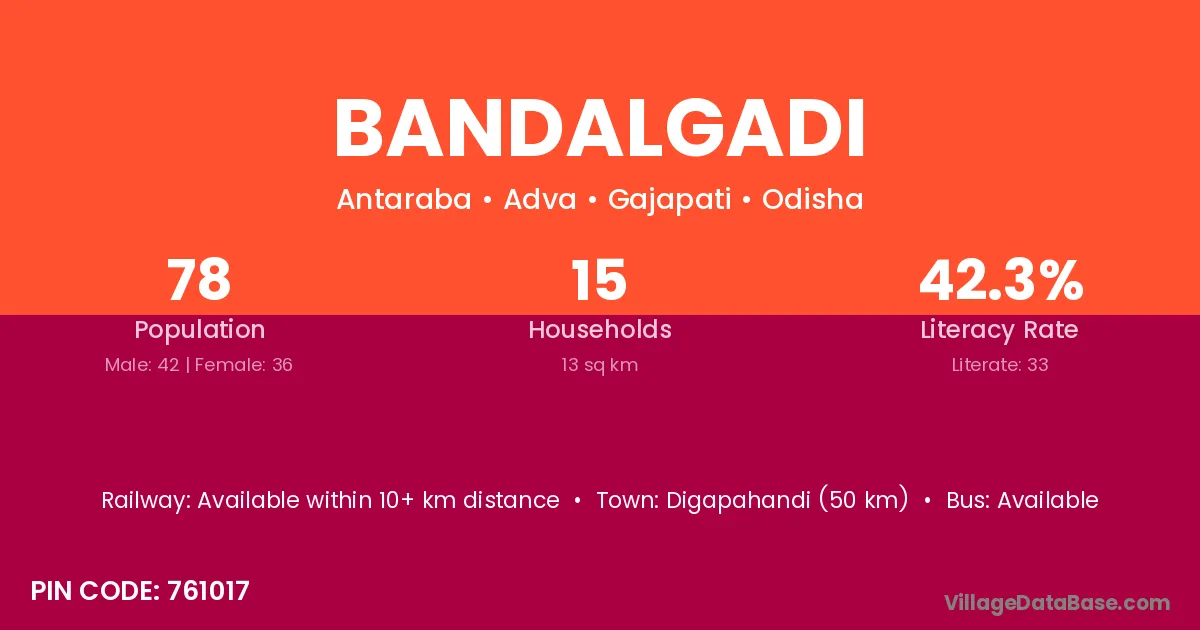 Digapahandi (50 km) is the nearest town to Bandalgadi village for major economic activities and is located approximately 50 km away.
