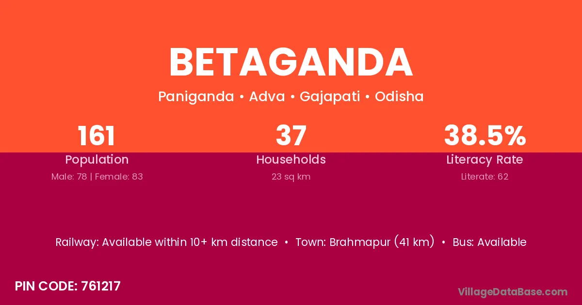 Brahmapur (41 km) is the nearest town to Betaganda village for major economic activities and is located approximately 41 km away.