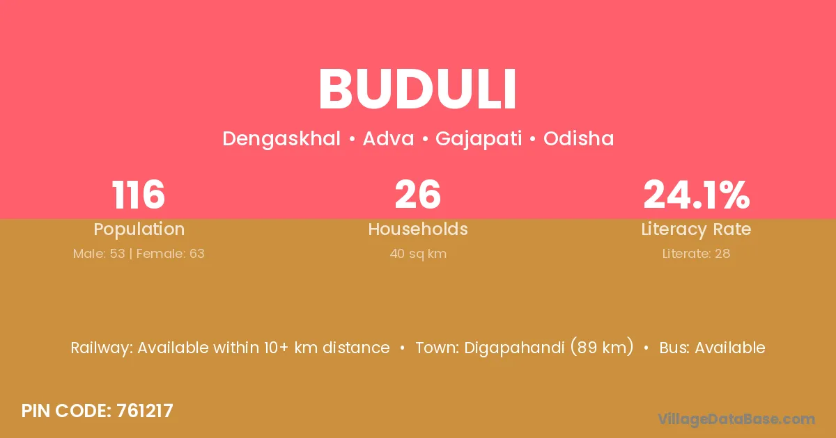 Digapahandi (89 km) is the nearest town to Buduli village for major economic activities and is located approximately 89 km away.