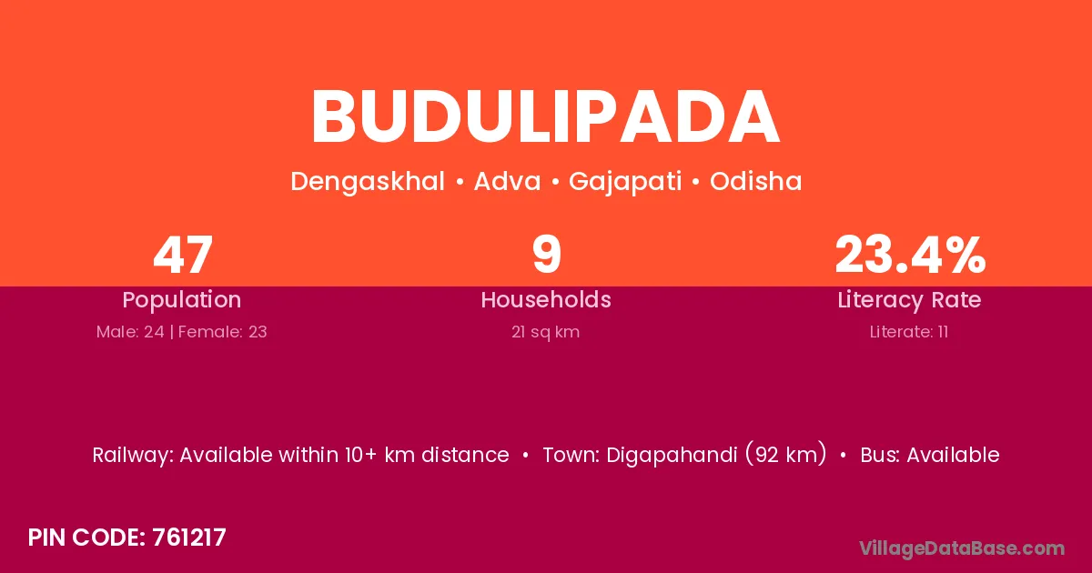 Budulipada village has a total population of 47 people, of which 24 are males and 23 are females.