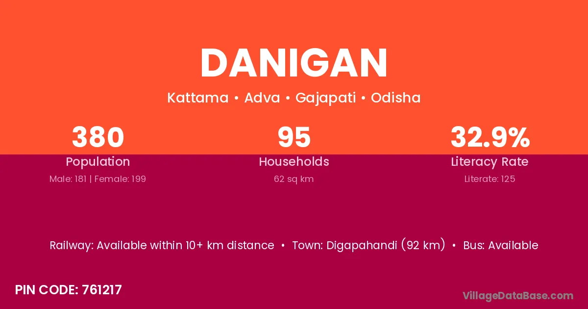 Digapahandi (92 km) is the nearest town to Danigan village for major economic activities and is located approximately 92 km away.