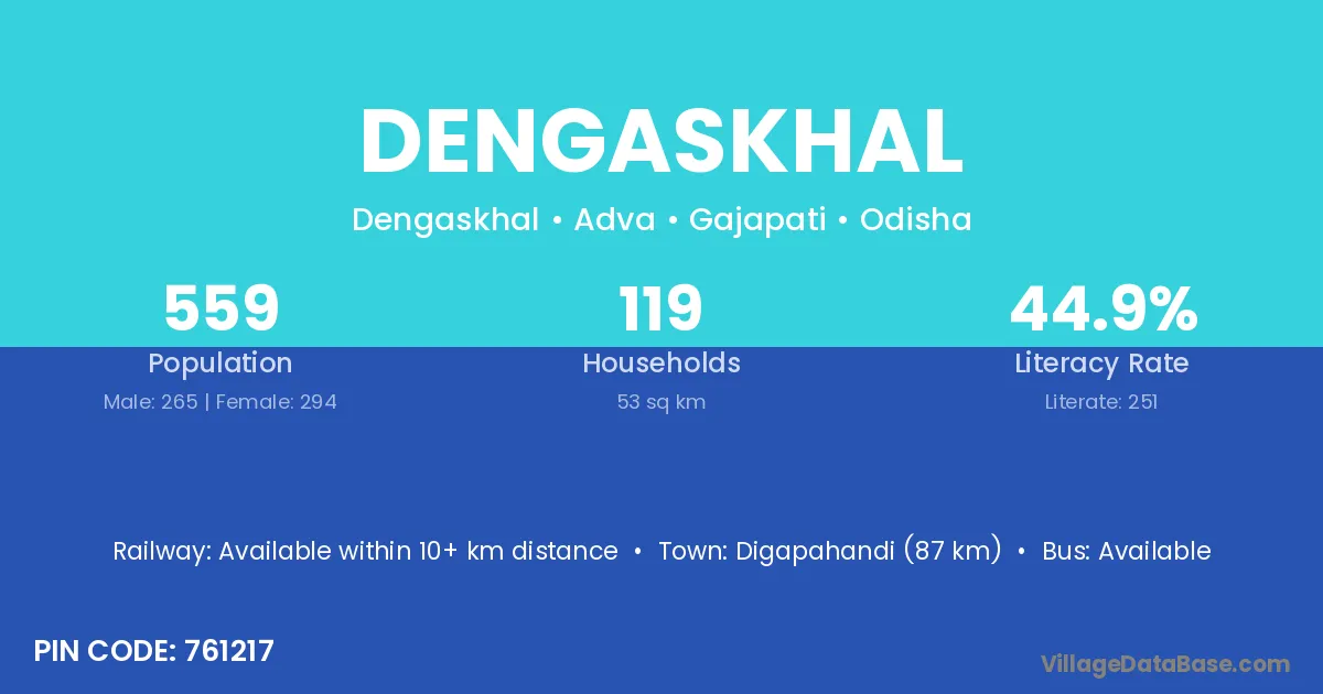 Digapahandi (87 km) is the nearest town to Dengaskhal village for major economic activities and is located approximately 87 km away.