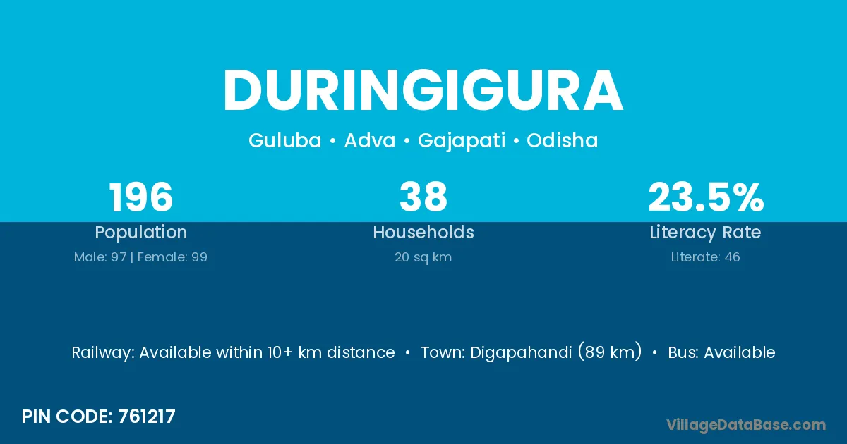 Digapahandi (89 km) is the nearest town to Duringigura village for major economic activities and is located approximately 89 km away.