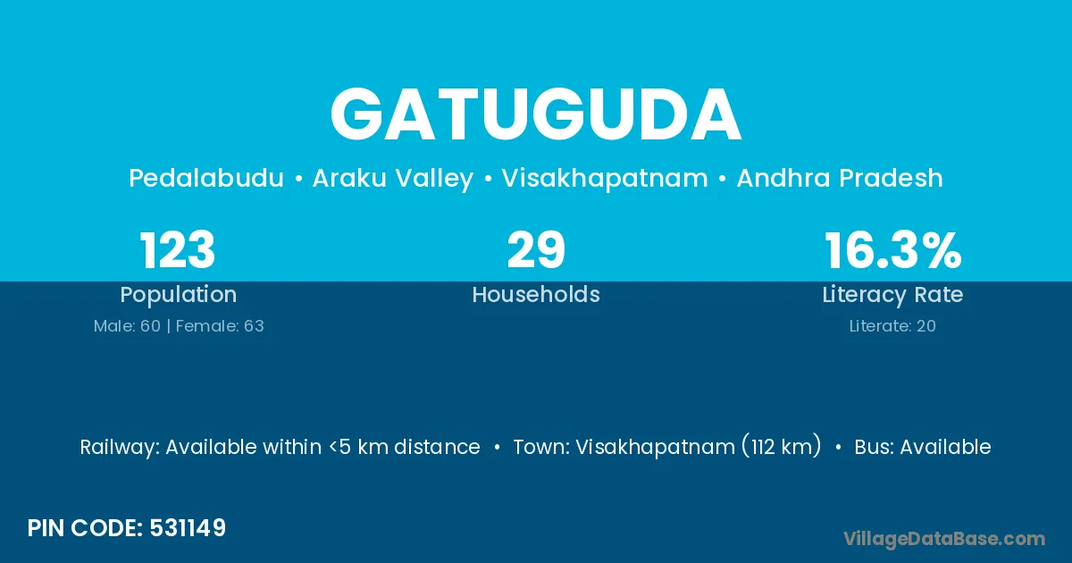 Gatuguda village has a total population of 238 people, of which 109 are males and 129 are females.