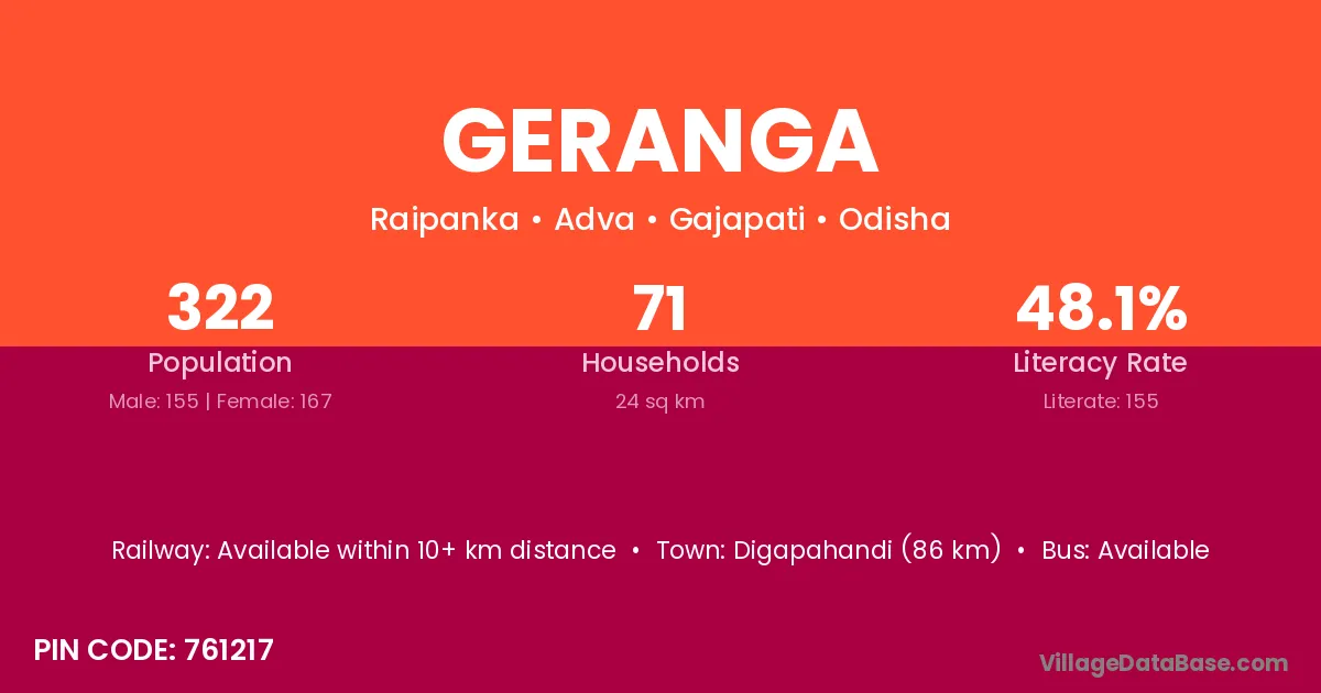 Digapahandi (86 km) is the nearest town to Geranga village for major economic activities and is located approximately 86 km away.