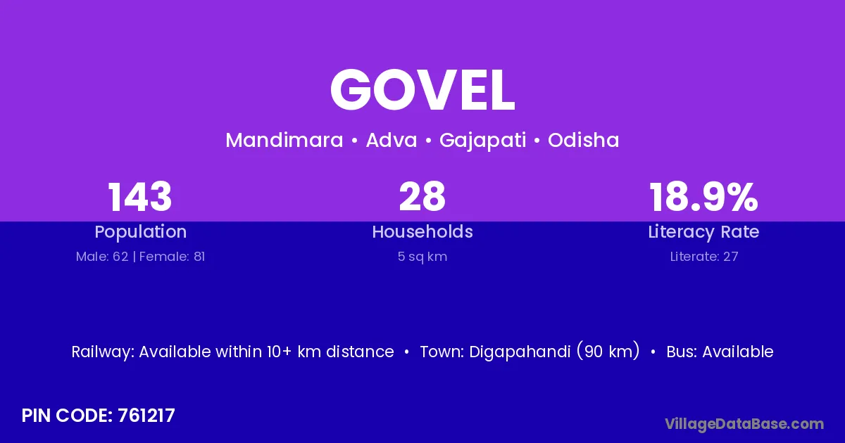 Digapahandi (90 km) is the nearest town to Govel village for major economic activities and is located approximately 90 km away.
