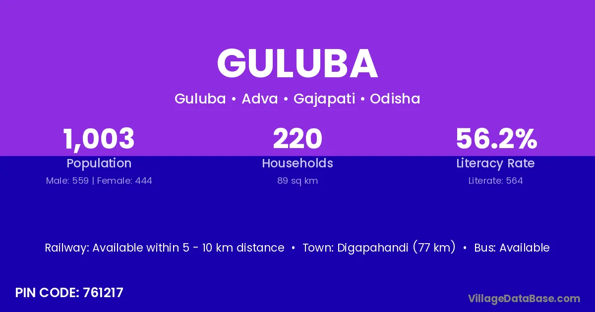 Digapahandi (77 km) is the nearest town to Guluba village for major economic activities and is located approximately 77 km away.