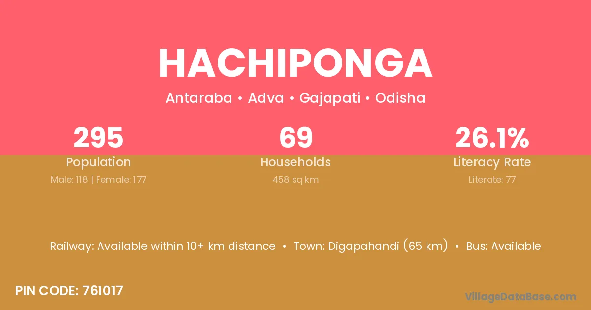 Digapahandi (65 km) is the nearest town to Hachiponga village for major economic activities and is located approximately 65 km away.