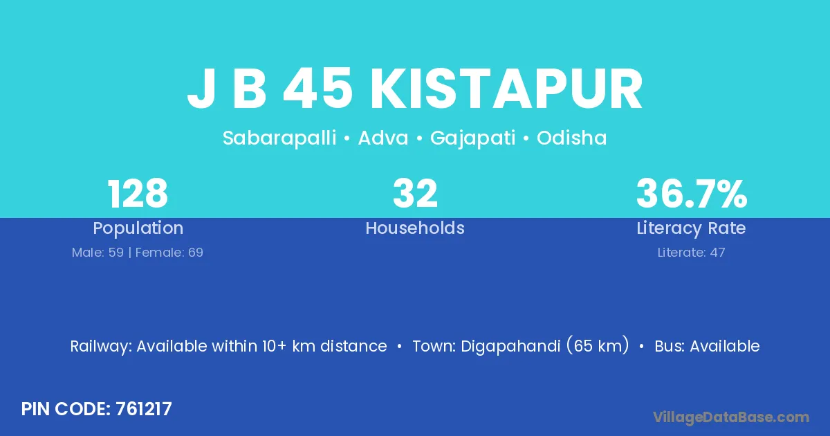 Digapahandi (65 km) is the nearest town to J B 45 Kistapur village for major economic activities and is located approximately 65 km away.