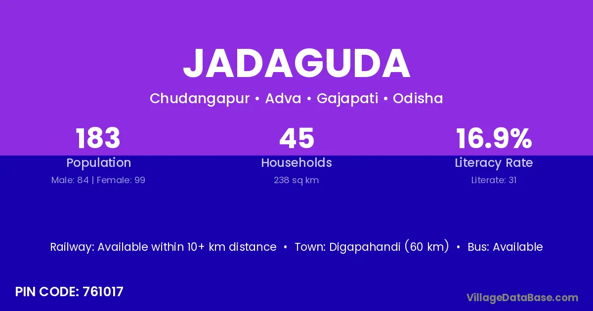 Digapahandi (60 km) is the nearest town to Jadaguda village for major economic activities and is located approximately 60 km away.