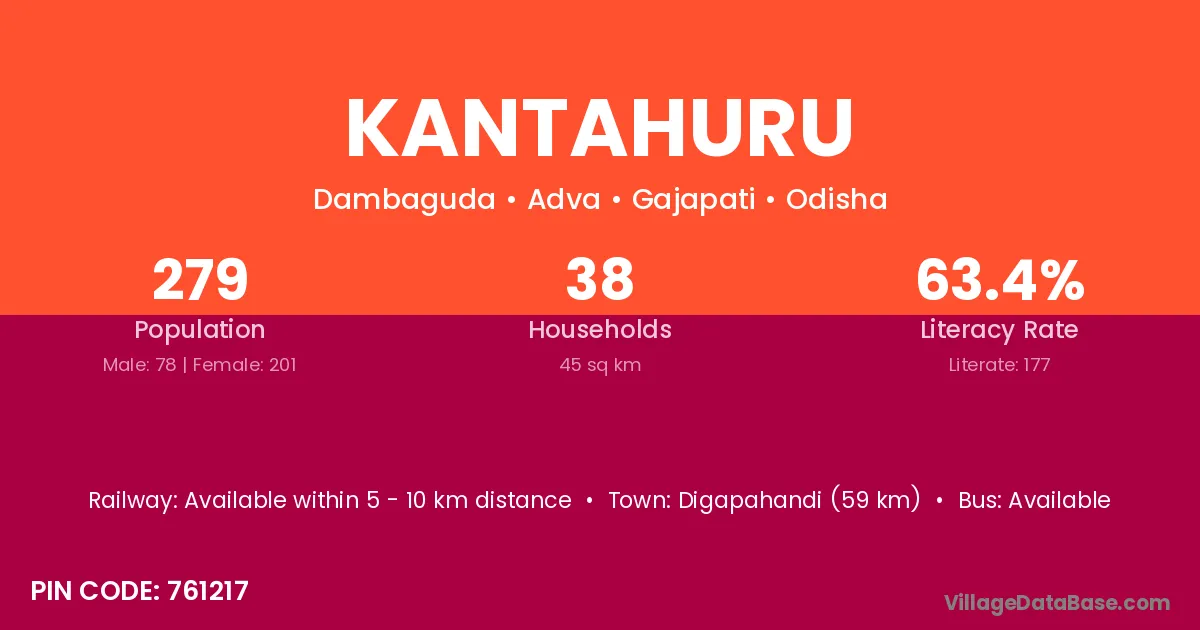 Kantahuru village has a total population of 279 people, of which 78 are males and 201 are females.