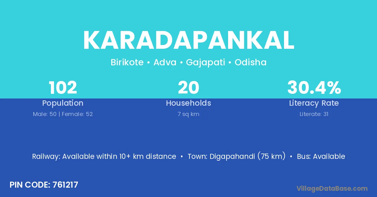 Digapahandi (75 km) is the nearest town to Karadapankal village for major economic activities and is located approximately 75 km away.