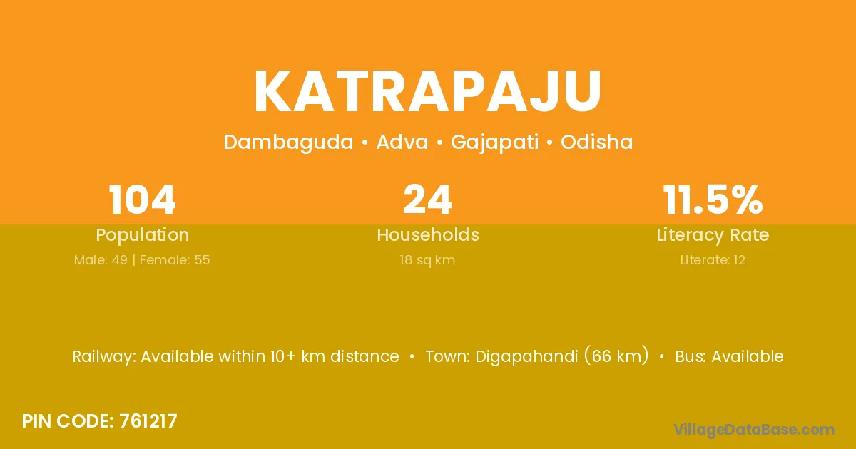 Digapahandi (66 km) is the nearest town to Katrapaju village for major economic activities and is located approximately 66 km away.