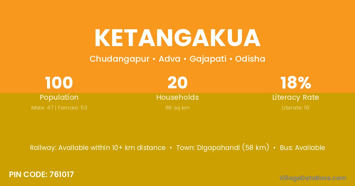 Digapahandi (58 km) is the nearest town to Ketangakua village for major economic activities and is located approximately 58 km away.