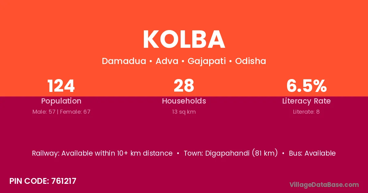Digapahandi (81 km) is the nearest town to Kolba village for major economic activities and is located approximately 81 km away.