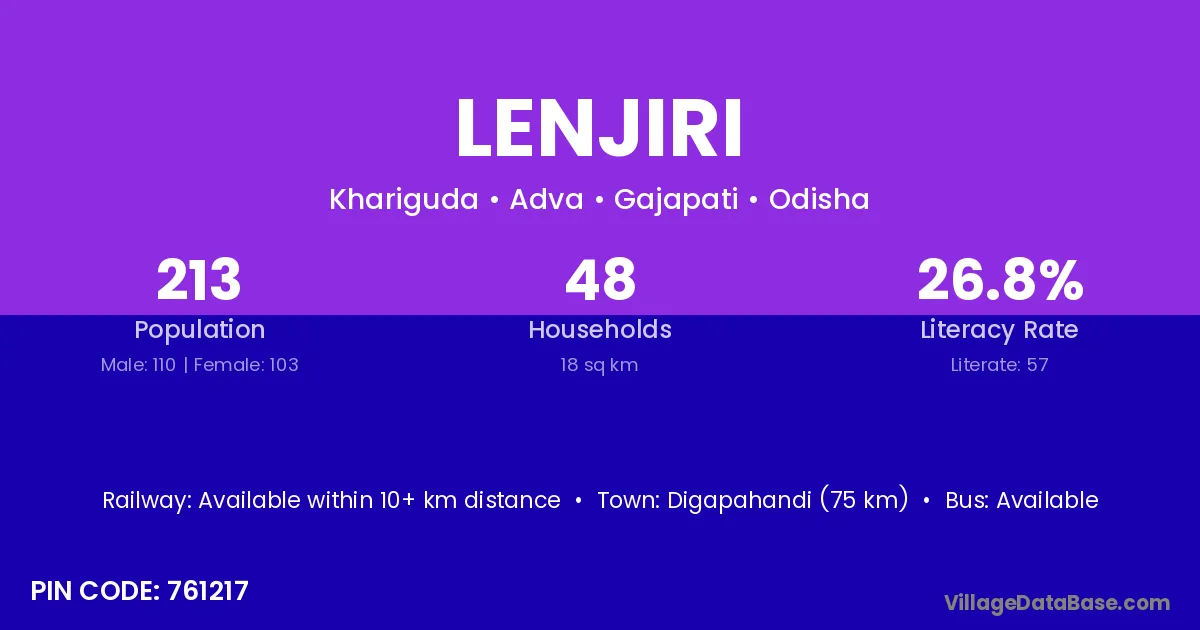 Digapahandi (75 km) is the nearest town to Lenjiri village for major economic activities and is located approximately 75 km away.