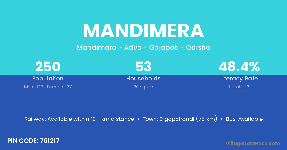 Digapahandi (78 km) is the nearest town to Mandimera village for major economic activities and is located approximately 78 km away.