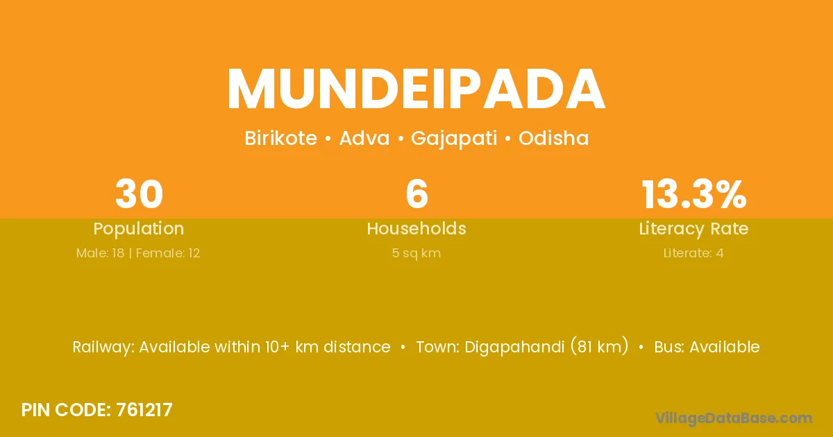 Digapahandi (81 km) is the nearest town to Mundeipada village for major economic activities and is located approximately 81 km away.
