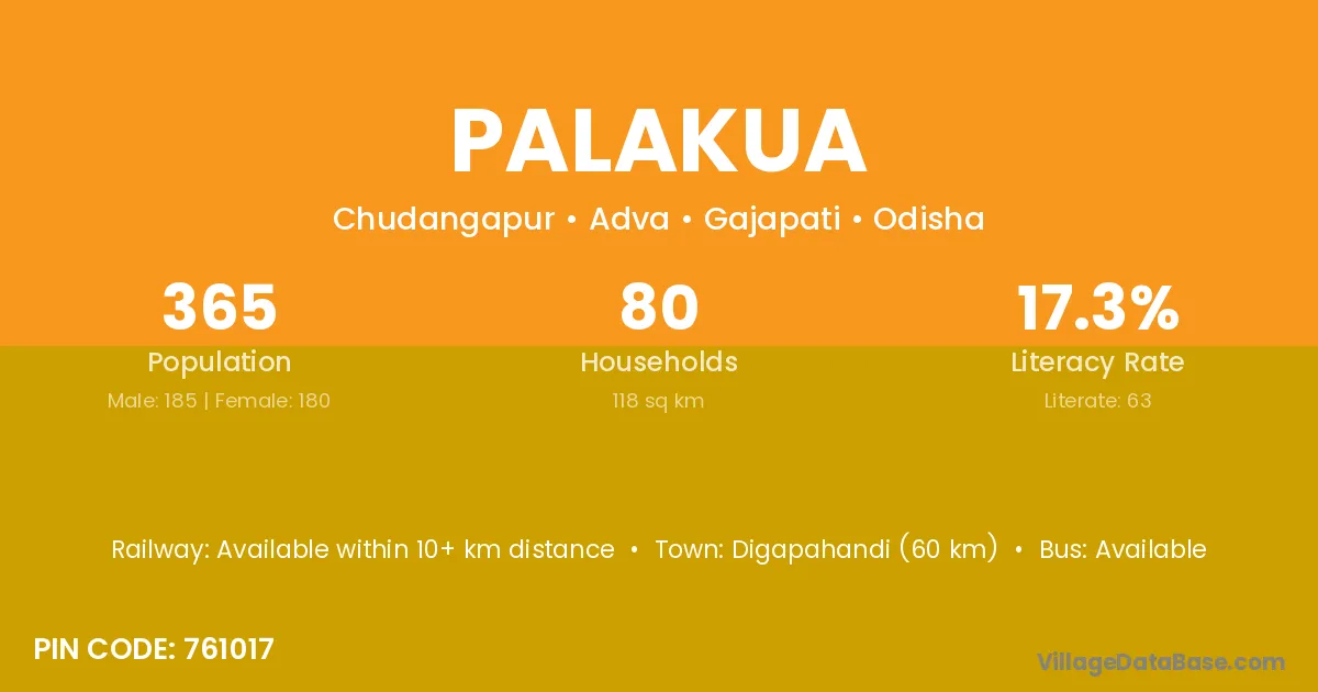 Digapahandi (60 km) is the nearest town to Palakua village for major economic activities and is located approximately 60 km away.