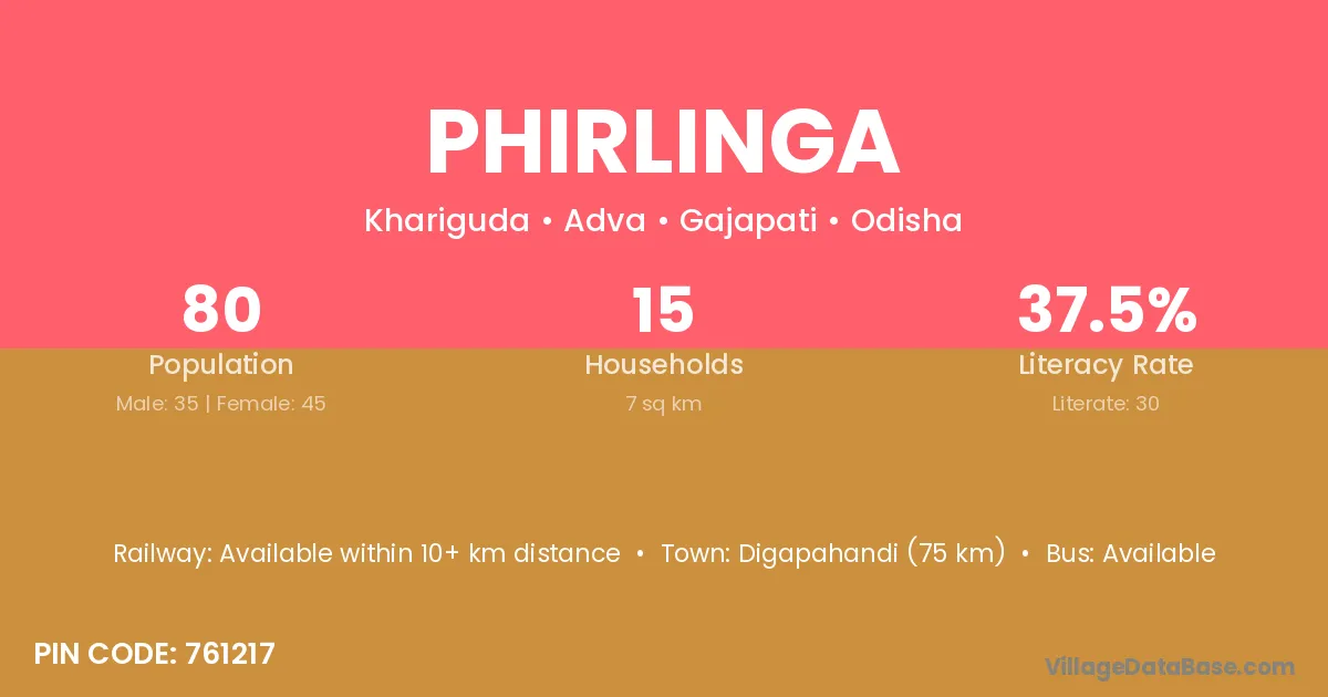 Digapahandi (75 km) is the nearest town to Phirlinga village for major economic activities and is located approximately 75 km away.
