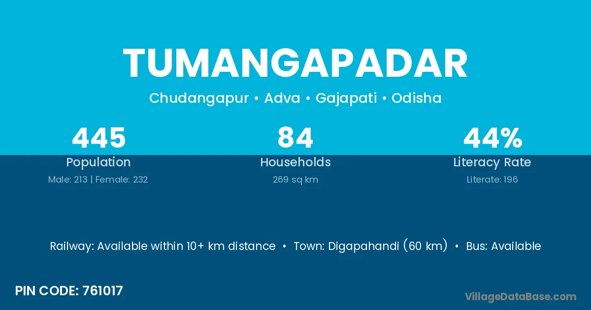 Digapahandi (60 km) is the nearest town to Tumangapadar village for major economic activities and is located approximately 60 km away.