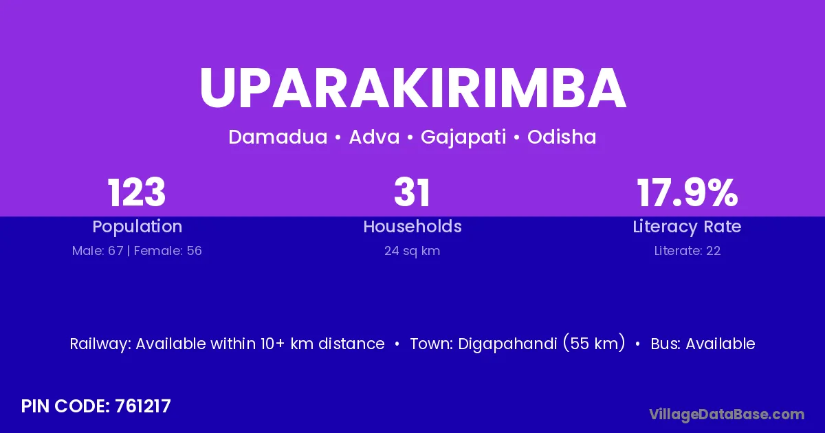 Uparakirimba village is located in the Adva Tehsil of the Gajapati district in Odisha .