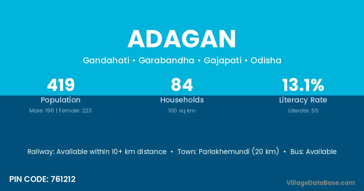 Parlakhemundi (20 km) is the nearest town to Adagan village for major economic activities and is located approximately 20 km away.