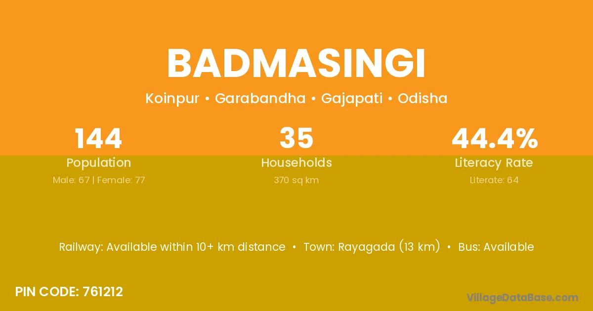 Rayagada (13 km) is the nearest town to Badmasingi village for major economic activities and is located approximately 13 km away.
