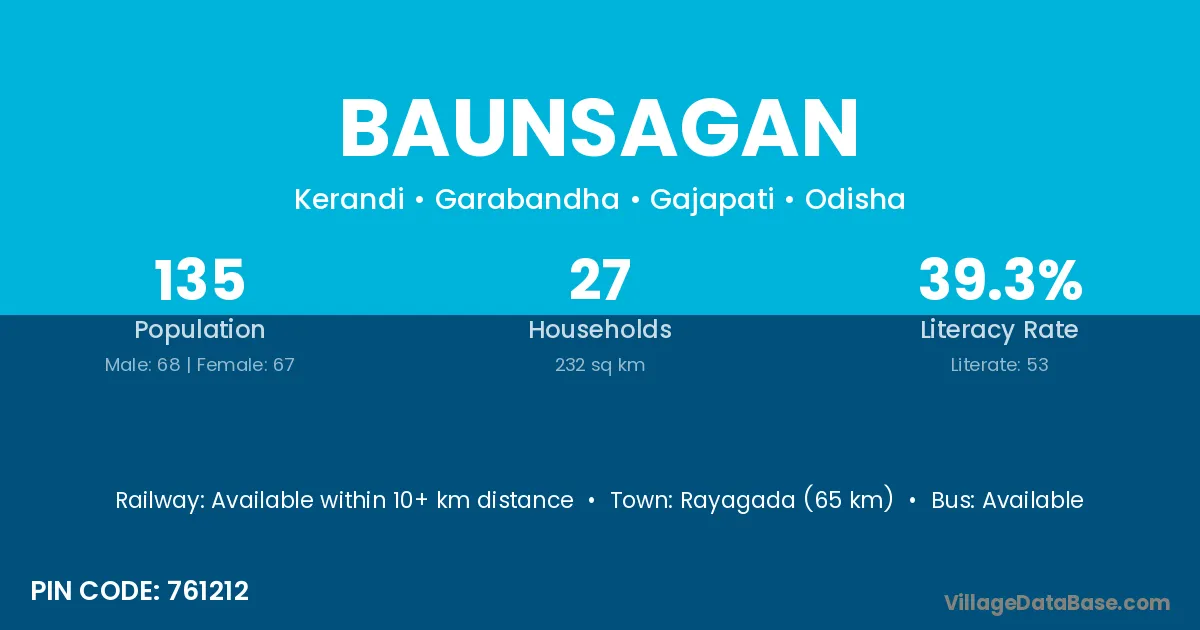Rayagada (65 km) is the nearest town to Baunsagan village for major economic activities and is located approximately 65 km away.