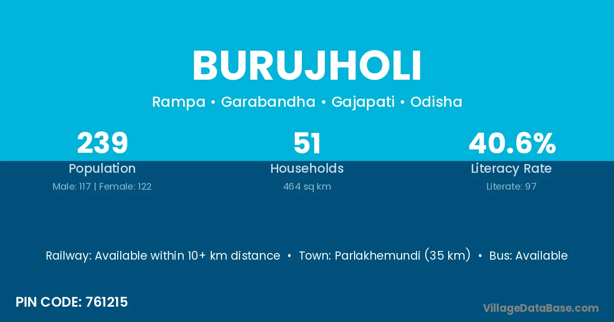 Parlakhemundi (35 km) is the nearest town to Burujholi village for major economic activities and is located approximately 35 km away.