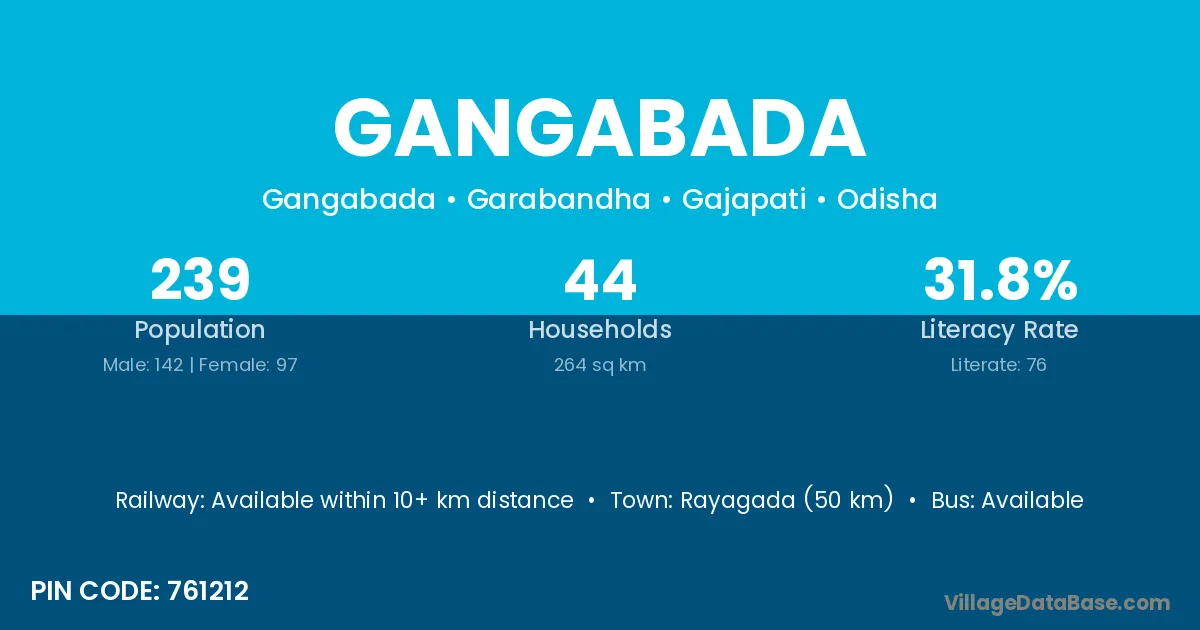 Rayagada (50 km) is the nearest town to Gangabada village for major economic activities and is located approximately 50 km away.