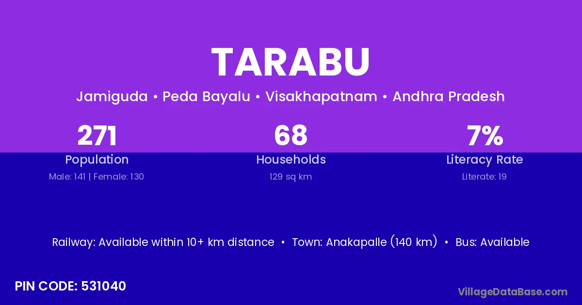 Rayagada (35 km) is the nearest town to Tarabu village for major economic activities and is located approximately 35 km away.