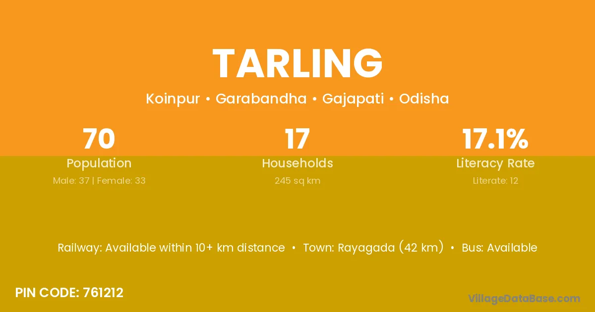 Rayagada (42 km) is the nearest town to Tarling village for major economic activities and is located approximately 42 km away.